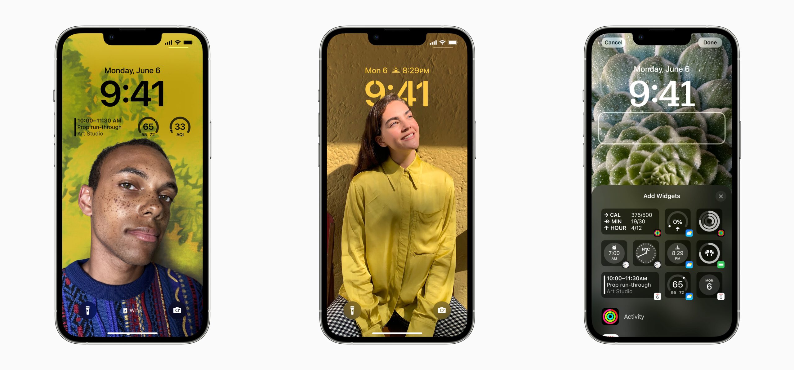อย่างแรกคือ iOS 16 ได้มีการเปลี่ยนแปลงหน้าจอ Lock Screen เป็นรูปแบบใหม่ โดยสามารถปรับแต่งหน้าจอได้ละเอียด และมีอิสระมากยิ่งขึ้นเช่น สามารถเปลี่ยนฟอนต์ เปลี่ยนสีตัวอักษร รวมถึงสามารถตั้งรูปหน้าจอให้เปลี่ยนไปเรื่อยๆ ได้ และยังสามารถเพิ่ม Widget บนหน้าจอล็อคได้อีกด้วย