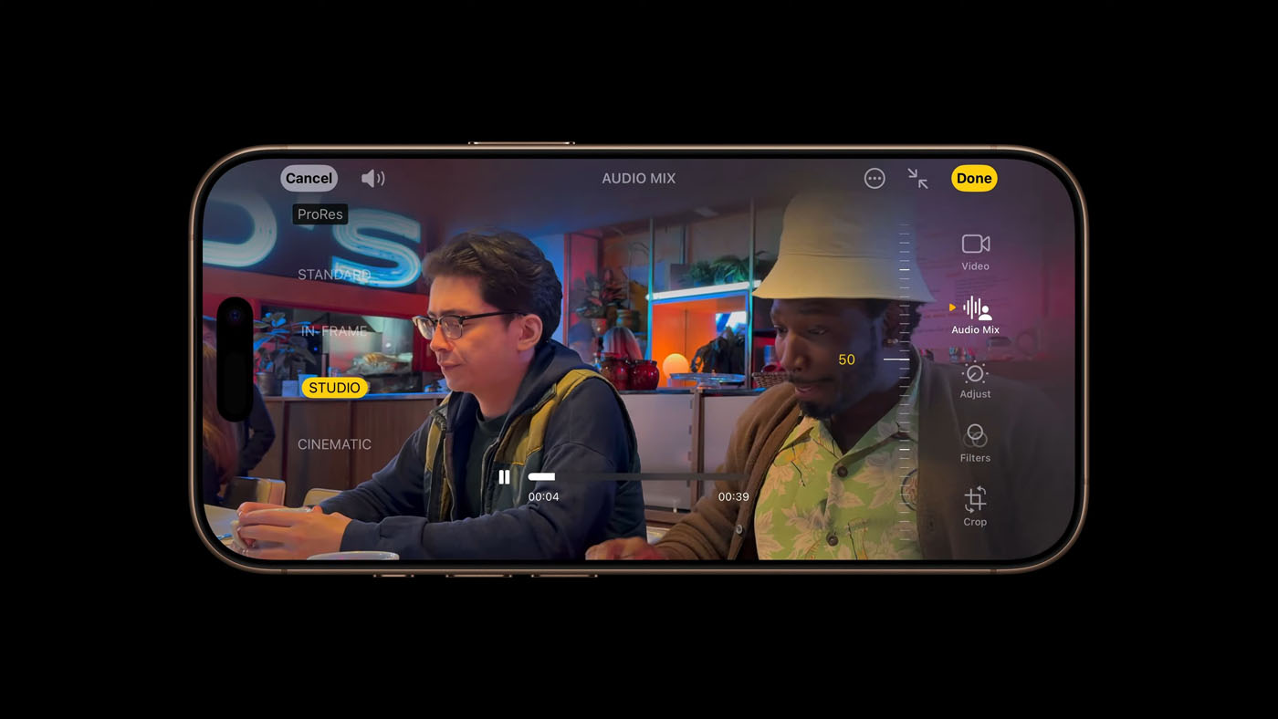 ไมโครโฟนใหม่คุณภาพระดับสตูดิโอ 4 ตัวที่บันทึกเสียงได้อย่างสมจริง และวันนี้ยังสามารถบันทึกวิดีโอพร้อมเสียงในระบบเสียงตามตำแหน่งได้แล้ว เพื่อให้ผู้ใช้ได้สัมผัสกับประสบการณ์การฟังที่เต็มอิ่มสมจริงด้วย AirPods, Apple Vision Pro หรือระบบเสียงรอบทิศทาง นอกจากนี้ผลิตภัณฑ์ตระกูล iPhone 16 Pro ยังเพิ่มวิธีใหม่ๆ ที่สร้างสรรค์ในการตัดต่อเสียงของวิดีโอด้วยการผสมเสียงหรือ Audio Mix ที่ขับเคลื่อนด้วยระบบอัจฉริยะสุดล้ำและการเรียนรู้ของระบบ (ML) โดยคุณสมบัติการผสมเสียงให้ผู้ใช้ปรับเสียงหลังจากบันทึกไปแล้วให้โฟกัสไปที่เสียงของบุคคลในกล้อง ทำให้เสียงฟังดูเหมือนกับบันทึกในสตูดิโอระดับมืออาชีพ หรือวางตำแหน่งของแทร็คเสียงพูดให้อยู่ด้านหน้าและวางตำแหน่งของเสียงในสภาพแวดล้อมให้เป็นเสียงรอบทิศทาง พร้อมด้วยการลดเสียงลมที่ใช้อัลกอริทึม ML อันทรงพลังในการลดเสียงที่ไม่พึงประสงค์เพื่อให้เสียงมีคุณภาพดีขึ้น และมีฟีเจอร์ใหม่ที่มาคู่กันคือ Audio Mix เลือกปรับเสียงพูดจากวิดีโอที่ถ่ายมาได้ 3 รูปแบบ ได้แก่