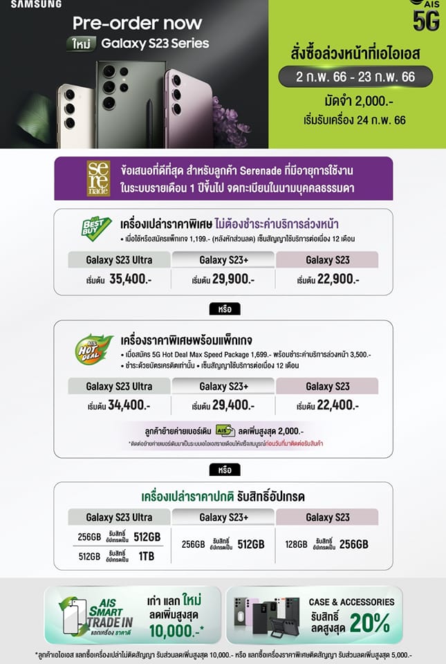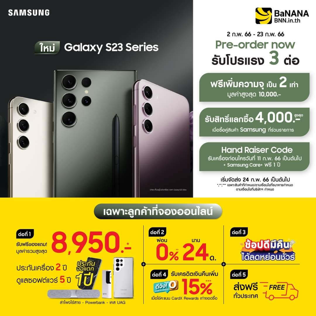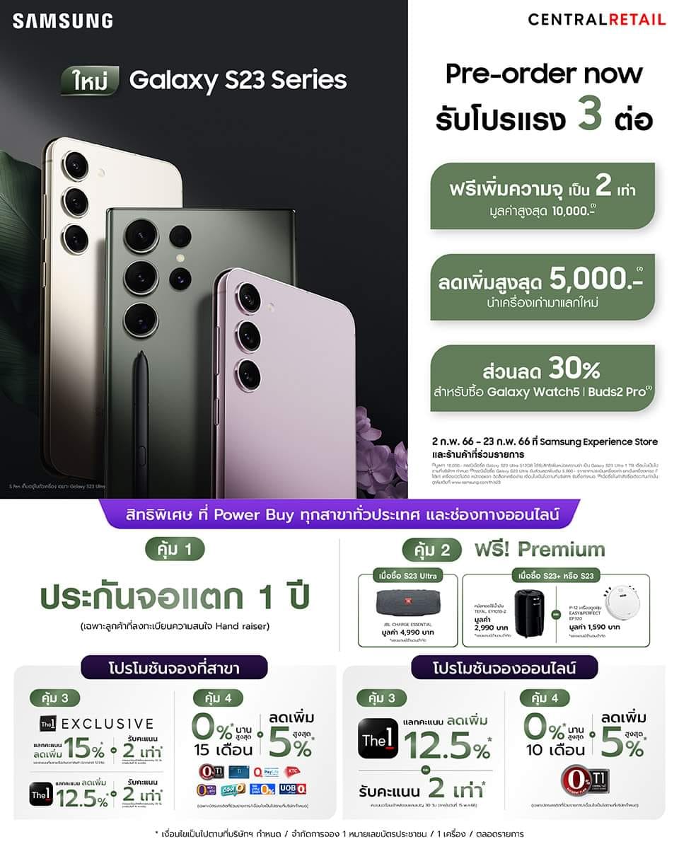 หลังจากที่ได้มีการเปิดตัว Samsung Galaxy S23 Series พร้อมเปิดราคาจัดจำหน่ายในไทยไปเป็นที่เรียบร้อยแล้ว วันนี้แอดได้ทำการรวบรวมโปรโมชั่นของ Samsung จากทุกค่ายมือถือหลักทั้ง TRUE, AIS และ DTAC รวมถึงตัวแทนจำหน่ายมือถืออย่าง Banana, Jaymart และ Powerbuy มาให้ทุกคนได้ดูเปรียบเทียบกัน โดยหากใครยังลังเลว่าจะซื้อ Samsung S23 Series รุ่นไหนดี สามารถดูที่แอดสรุปสเปคของ S23 Series ได้ที่บทความ สรุปงานเปิดตัว Samsung Galaxy S23 Series เผยเสปค ราคา ฟีเจอร์ ครบทุกรุ่น !!