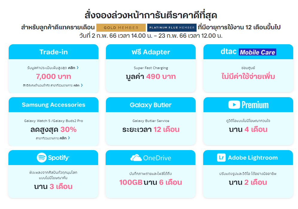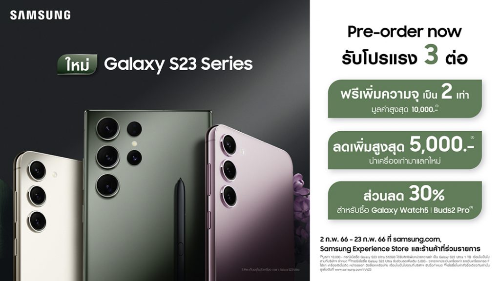 - รับเครื่องก่อนใคร ฟรี Samsung Care + พร้อมฟรีประกันจอแตกนาน 1 ปี (เมื่อสั่งจองหรือสั่งซื้อล่วงหน้าระหว่าง วันที่ 2 ก.พ. 66 – 8 ก.พ. 66)