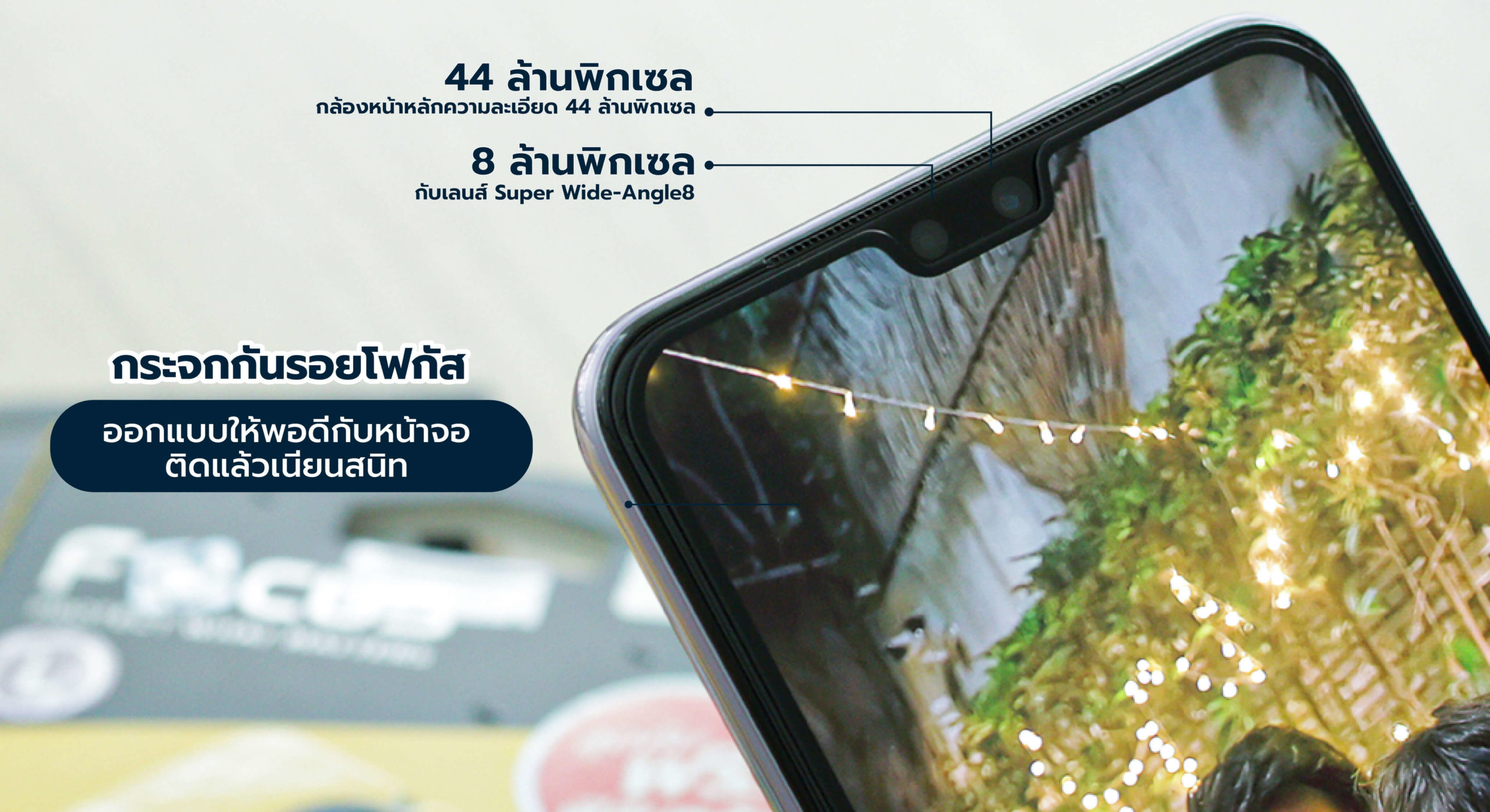 เรื่องกล้อง ก็ถือเป็นอีกจุดไฮไลท์ของสมาร์ทโฟนเครื่องนี้เลยครับ สำหรับกล้องหน้า ที่มีความละเอียด 44 ล้านพิกเซลนี้ เค้ามาด้วยเทคโนโลยี กล้องหน้าคู่ Eye AutoFocus ที่มาพร้อมกับโหมดโฟกัสอัตโนมัติ (AF) สามารถจับโฟกัสจากระยะถ่าย 15 CM ถึงจุดที่ไกลที่สุดได้อย่างชัดเจน ไม่ว่าจะถ่ายระยะใกล้หรือจะใช้ไม้เซลฟี่ระยะไกลแค่ไหน ก็สามารถถ่ายเซลฟี่ได้อย่างคมชัด