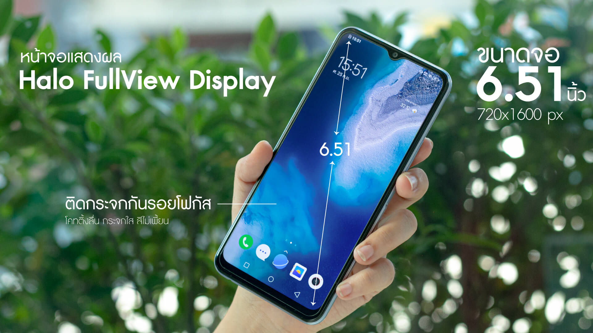 - หน้าจอแสดงผล : Halo FullView Display ขนาดจอ 6.51 นิ้ว, ความละเอียด 1600 x 720 พิกเซล พร้อมด้วยโหมดปกป้องสายตา